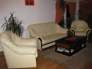 canapea cu 2 fotolii din imitatie de piele culoare crem, cadrul este de lemn si este achizitionata in 2006. in stare foarte buna,.Canapeaua este extensibila.